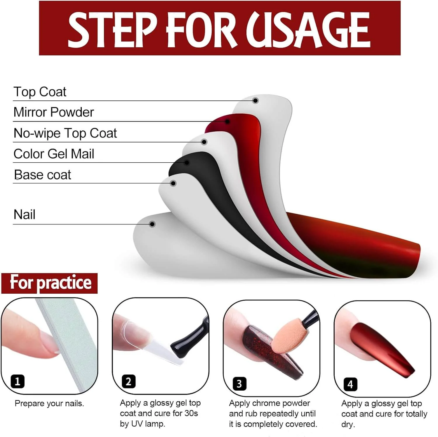 - WIDE APPLICATION: These powders must be used with Gel nail polish (colour gel, base coat and glossy gel top coat). Some regular Polish can also be used, but not all. These powders can be used on natural nails, UV gel nails, acrylic nails or false nail tips. You can use them very quickly. It is a good solution with rhinestones ใnail art fimo, or other accessories to build a nice nail art.